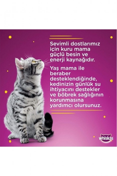WHISKAS® kuru ve yaş mama ile karışık beslemenizi öneriyoruz. Mama değiştirirken geçiş dönemini göz önünde bulundurunuz ve mama miktarını kedinizin ihtiyacına göre ayarlayınız. Kilo fazlası olan kediler için günük miktarı azaltınız. Serin ve kuru yerde kapalı olarak saklayınız. Yanında daima taze içme suyu bulundurun. Boğulmaya engel olmak için; torbaları bebeklerden çocuklardan ve evcil hayvanlardan uzak tutunuz.